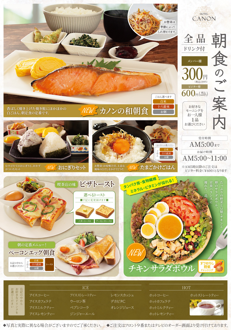 モーニングメニューリニューアル! 2025.11.10 本日よりモーニングメニューが新しくなります! カノンの和朝食、おにぎりセット、 たまごかけごはん、ピザトースト、 チキンサラダボウルが新登場。 メンバー様価格全品¥300(税込¥330)、ドリンク付となっております! ぜひご賞味ください♪ ↓メニューの詳細はこちら↓ 一覧へ戻る