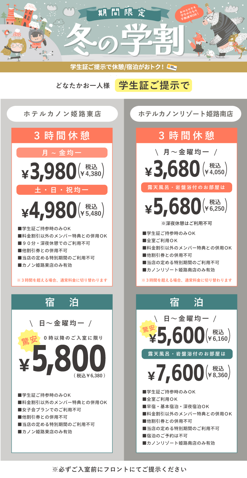 【期間限定】冬の学割キャンペーン!|【公式】姫路ラブホテル|カノンリゾート(Canon Resort)|姫路南店