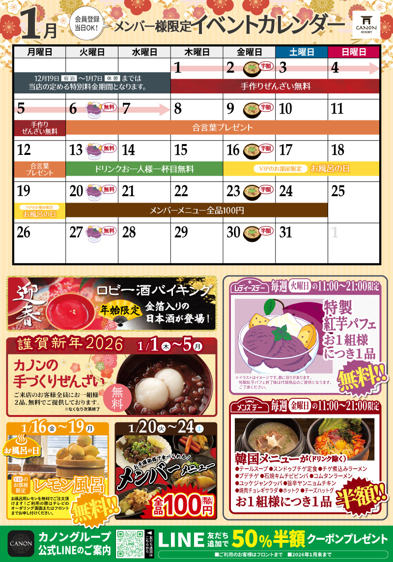 【1月度】メンバー様限定イベントカレンダー|【公式】姫路ラブホテル|カノンリゾート(Canon Resort)|姫路南店