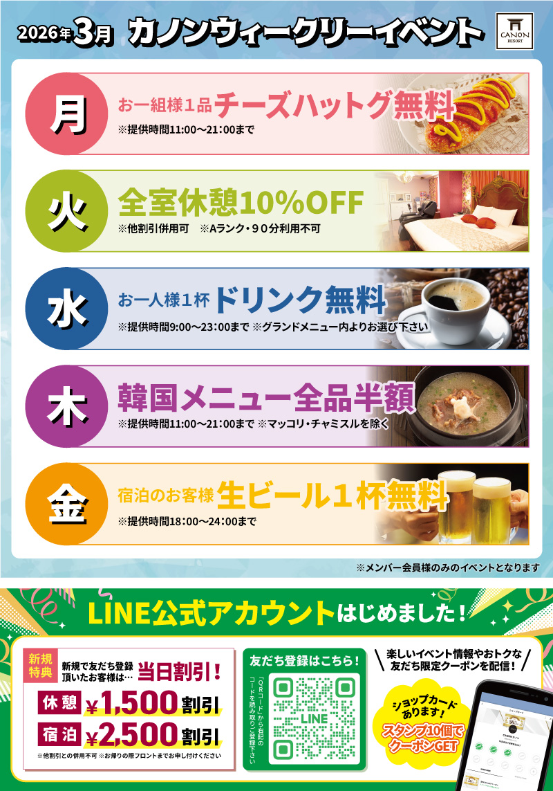 【3月度】メンバー様限定ウィークリーイベント|【公式】姫路ラブホテル|カノンリゾート(Canon Resort)|姫路南店